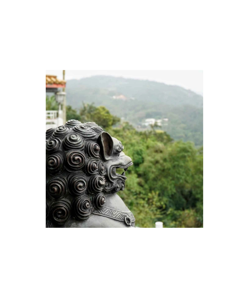 This photograph feels like a quiet moment shared with an ancient sentinel. A bronze temple lion – its mane carved into intricate spirals, each curl catching soft daylight – sits poised and watchful, gazing out over a blanket of misty forested hills. The sculpture’s expression is both fierce and serene: its open mouth frozen mid-roar, its posture proud, yet it radiates a calm authority. Time has left gentle traces on its metal surface, hints of patina settling into the grooves of its mane and around its ornate collar, giving it the dignity of age.